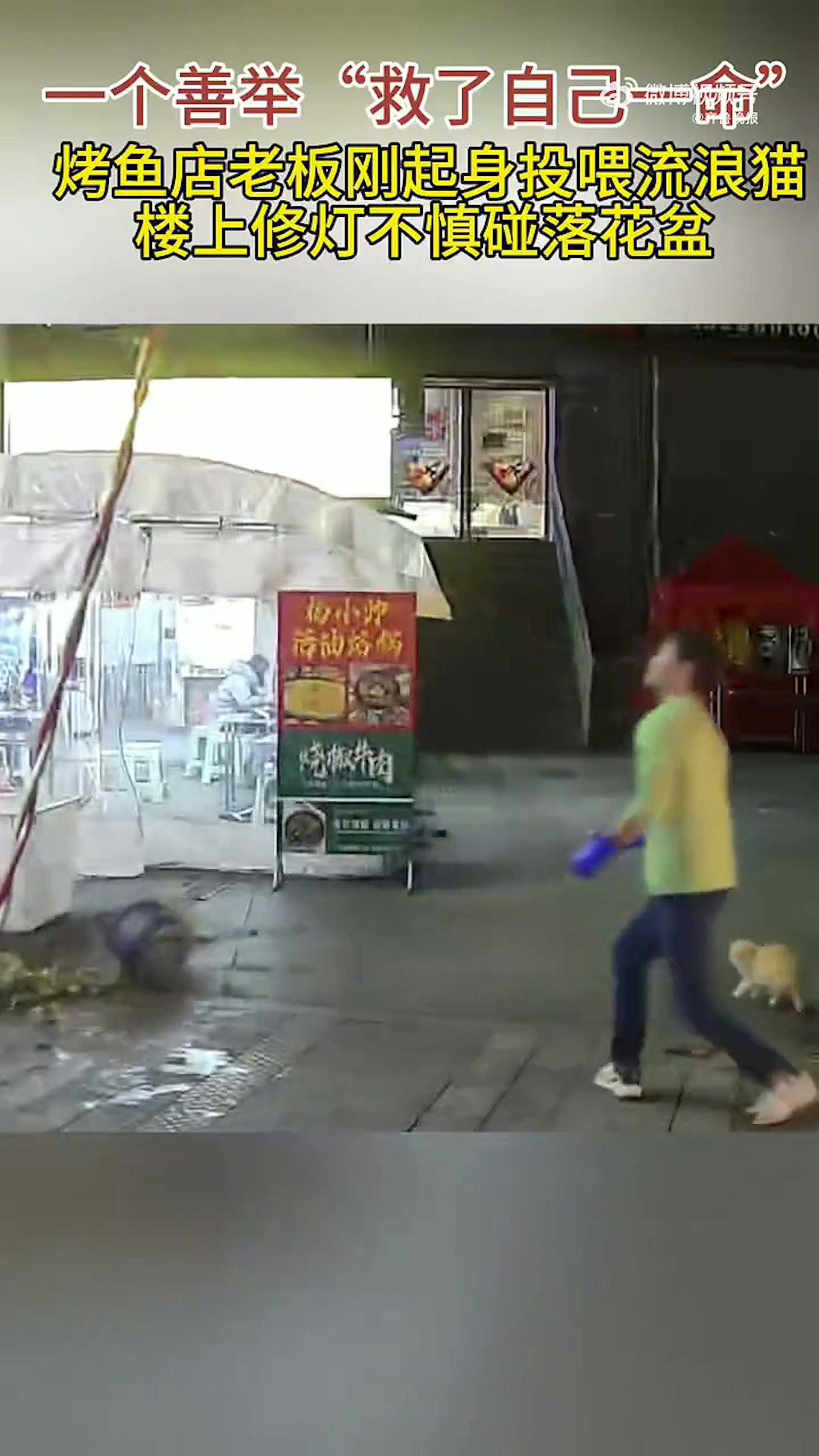 1月27日晚,一名男子發布視頻稱,烤魚店門口突發高空墜物,他因好心去餵幾米外的流浪貓才躲過一劫,撿回一命。網友在評論區紛紛感慨,好人有好報。