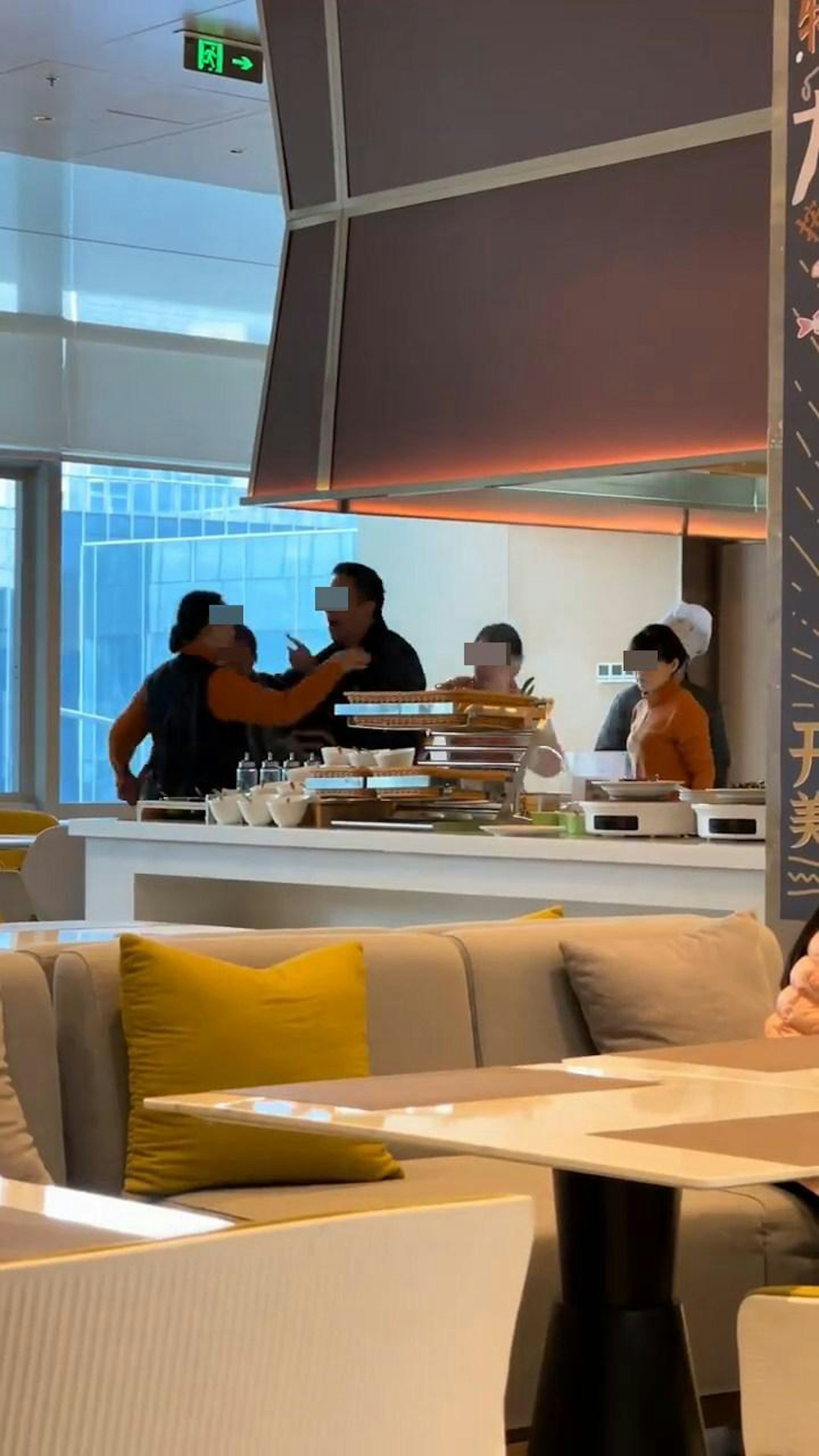內地微博瘋傳影片,江蘇有1對母子在五星級酒店吃自助餐時,試圖自行打包餐點被阻,兒子竟「發爛渣」狂打女職員。(微博影片截圖)www1.tvboxnow.com3 o7 Z$ y* `' g: y4 }: k& U8 T