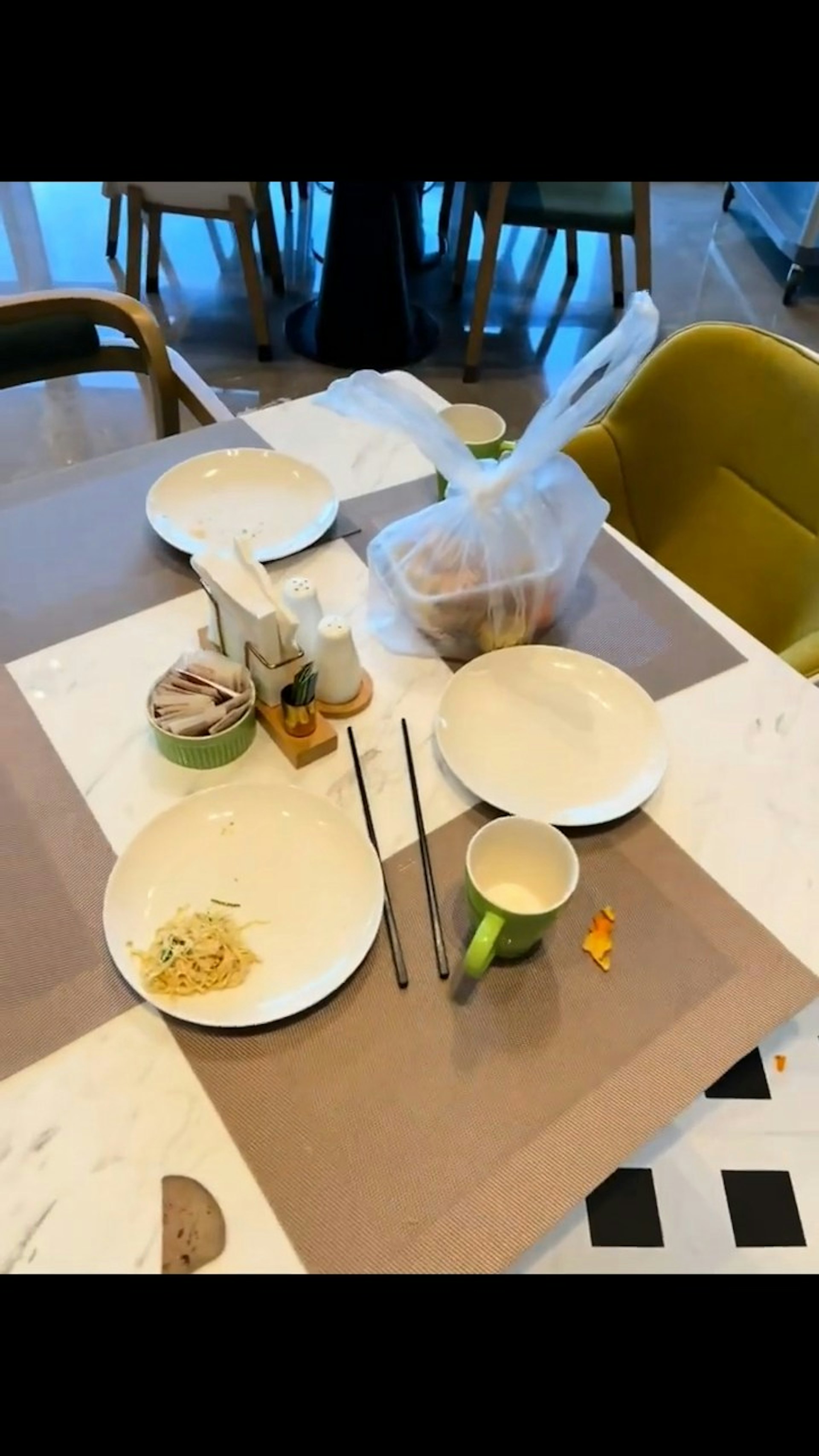 I7 e1 R! ]% N0 f& _男子與母親把已「打包」的食物留在餐桌上。(微博影片截圖)7 f3 n. `7 P, I+ r j) ?# {# [
