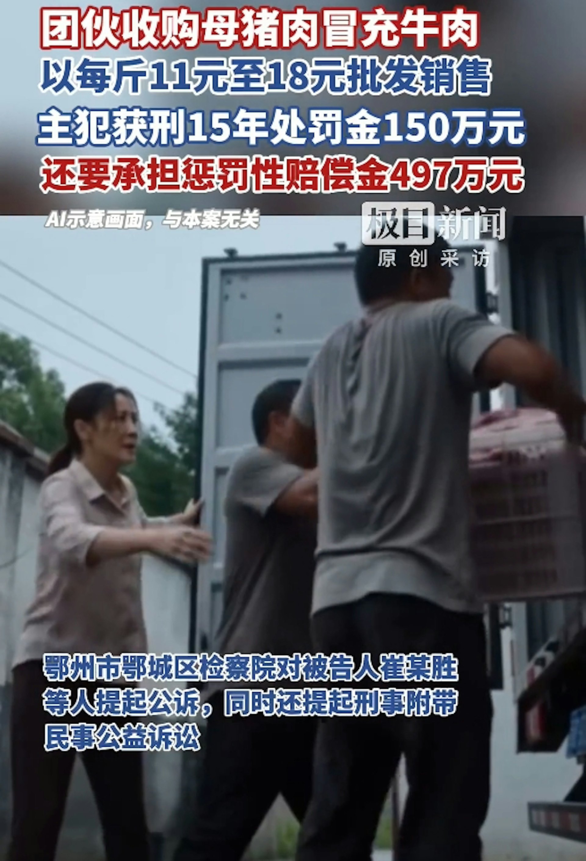 : O4 d L8 {# Z. O8 @8 a7 x0 s6 F2 y$ Vwww1.tvboxnow.com大陸湖北省鄂州市一起以母豬肉冒充牛肉的食品詐欺案,歷經一、二審定讞,主犯崔某勝被判處有期徒刑15年、罰金150萬元人民幣,並須承擔懲罰性賠償金497.47萬元人民幣。