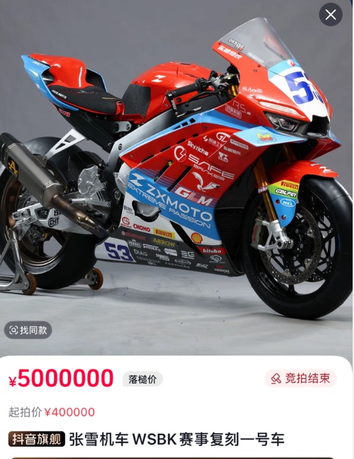張雪機車 WSBK 冠軍複刻賽車開拍45秒即以500萬成交。(網絡截圖), {6 x- m: q) W3 _- T% s. K